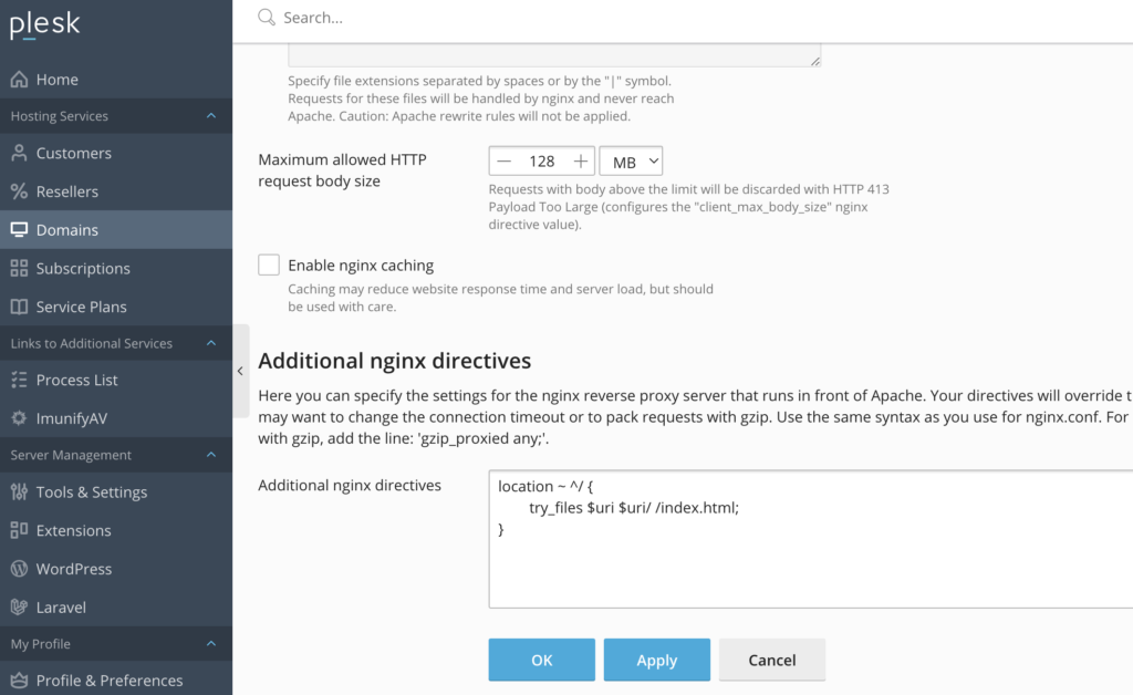Goto to Plesk Hosting & DNS >> Apache & nginx Settings for [my.domain.name] >> Additional nginx directives to make it work as desired